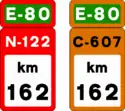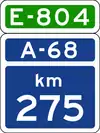Hito kilométrico en autopista y autovía que, además, forma parte de un itinerario europeo. S-571 Indica el punto kilométrico de la autopista o autovía que, además, forma parte de un itinerario europeo, cuya identificación aparece en la parte superior de la señal. |