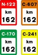 Hito kilométrico en carretera convencional. S-572 Indica el punto kilométrico de una carretera convencional cuya identificación aparece en la parte superior sobre el fondo del color que corresponda a la red de carreteras a la que pertenezca: ROJO: carretera de la red general del Estado (ver señal S-420). NARANJA: carretera autonómica de primer nivel (ver señal S-430). VERDE: carretera autonómica de segundo nivel (ver señal S-440). AMARILLO: carretera autonómica de tercer nivel (ver señal S-450). |