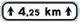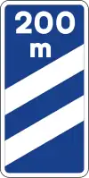Distancia al comienzo del peligro o prescripción S-800 Indica la distancia desde el lugar donde está la señal a aquel en que comienza el peligro o comienza a regir la prescripción de aquella. En el caso de que esté colocada bajo la señal de advertencia de peligro estrechamiento de calzada, puede indicar la anchura libre del citado estrechamiento. |