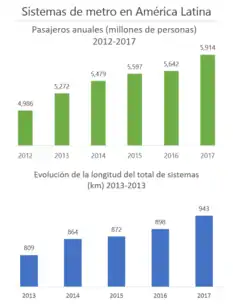 Brasil es el país latino con la mayor cantidad de sistemas de metro, con ocho sistemas (São Paulo, Río de Janeiro, Salvador, Recife, Belo Horizonte, Porto Alegre, Brasília y Fortaleza), seguido por Venezuela con cuatro sistemas de metro (Caracas, Maracaibo, Valencia y Los Teques). El Metro de la Ciudad de México transporta la mayor cantidad de pasajeros en toda América Latina. Éste es el segundo sistema de metro más utilizado en América (después del Metro de Nueva York), el noveno del mundo y el decimotercero en longitud.[1] El primer sistema de metro inaugurado en América Latina fue el subterráneo de Buenos Aires, en 1913.