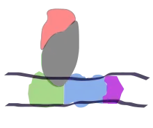 Subunidades en la NADH deshidrogenasa obtenidas mediante la utilización de agentes caotrópicos suaves. Los trazos en negro indican cada una de las capas lipídicas de la membrana interna mitocondrial. El subcomplejo Iα está formado por las subcomplejos rojo, gris y verde. El subcomplejo Iβ está formado por los subcomplejos verde, azul y violeta. Con distintas concentraciones se obtendrían otros subcomplejos, como el Iγ, formado por la subunidad verde, y el Iλ, formado por los subcomplejos rojo y gris. En violeta se destaca la posición de las subunidades ND4 y ND5 humanas, importantes en la regulación de la producción de superóxido.
