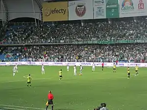 - 3 de marzo. Nacional empató 0-0 con el Deportes Quindío por la quinta fecha del Apertura.[23] Días después se conoció la sanción de la DIMAYOR a causa de la invasión al campo de juego por parte de los hinchas ocurrida en el previo al partido, que se ocasionó por desórdenes entre los mismos aficionados en las tribunas. Esta sanción estableció dos fechas a puerta cerrada en los juegos de local para el club verdolaga.[24]