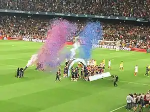 ![]() Celebración de los jugadores del FC Barcelona el 12º título de Supercopa de España ante el Sevilla FC | |||||