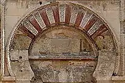 - arco emiral cordobés: cuando el despiece radial de las dovelas es igual y las juntas apuntan al mismo centro. El despiece se manifiesta en la decoración alternada de atauriques y dovelas lisas a la almagra (rojas).
