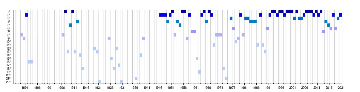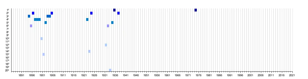 Títulos | 0 | 0 | 0 | 0 | 3 | 1 | 0 | 1 | 1 | 1 | 2 | 1 | 4 | 3 | 1 | 1 | 0 | 2 | 1 | 0 | 1 | 2 | 3 | 1 | 2 | 2 | 1 | 3 | 1 | 2 | 2 | 1 | 0 | 0 | 0 | 0 |