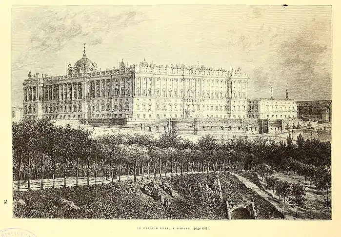 Le Palacio Real, a Madrid | ca. 1862 | Gustave Doré (dibujo sobre madera) | Aspecto del Palacio Real durante la estancia de Gustave Doré y el Barón de Davillier en la capital de España, el mismo año en que Galdós llegó a Madrid. Pertenece a la colección de grabados de Doré para el libro L'Espagne de Charles Davillier. | |