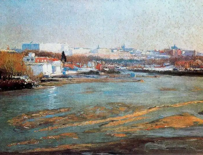 Madrid desde el Manzanares, en La Florida | ca. 1909 | Aureliano de Beruete | Vista de Madrid desde el río Manzanares, frente a La Florida en el camino del Pardo; se pueden reconocer al fondo las siluetas del Palacio Real, la iglesia de San Andrés y la gran cúpula de San Francisco el Grande. El rojizo colorido de los árboles de la ribera indican que el cuadro fue pintado en otoño. |