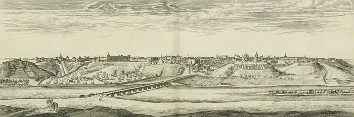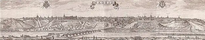 Profil de la ville de Madrid, capitale du royaume d'Espagne. | 1655-1675 | Israel Silvestre (1621-1691) | Dibujo conservado –en grabado de dos hojas– en la Bibliothèque nationale de France. Contemporáneo del grabado de Julius Milheuser. | |