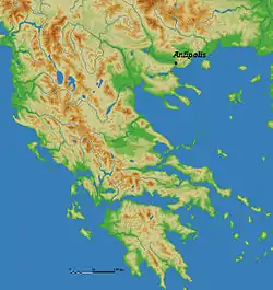 Anfípolis (en griego antiguo ᾿Aμφίπολις Amphípolis, en griego moderno Αμφίπολη Amfípoli) fue una ciudad griega de la Antigüedad, en Macedonia oriental, situada en la península semicircular formada por el río Estrimón a 4 km de su desembocadura. Su nombre se debía precisamente a esa situación. Estaba en una encrucijada de caminos, al oeste del monte Pangeo. El río la unía con el puerto de Eyón.