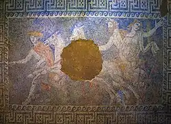 El complejo consta de un túmulo que se encuentra rodeado por un foso circular y una pared de piedra revestida con mármol de tres metros de alto y una circunferencia de unos 500 metros.[30] El túmulo cuenta con una avenida procesional que culmina en un pórtico custodiado por dos esfinges de mármol de Tasos,[31] dispuestas en un modo ligeramente similar a los mucho más antiguos leones de la puerta principal de Micenas. Dos cariátides esculpidas también en mármol de Tasos custodian una segunda cámara interior.[32]En esta cámara se ha hallado un mosaico que representa el rapto de Perséfone por Hades junto al que aparece Hermes Psicopompo.[33] [34] En la tercera cámara se halló la cabeza de una de las esfinges de la entrada, restos de las alas de las esfinges, fragmentos de una puerta de mármol y una tumba en cista con fragmentos de huesos y restos decorativos. Los restos óseos pertenecen al menos a cinco personas: una mujer mayor de 60 años, dos hombres adultos de entre 35 y 45 años, un niño y otra persona cuyos restos son los únicos que fueron incinerados.[35] [36] [37][38]