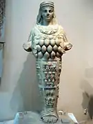 El hallazgo de numerosas dovelas en la cima de la colina y en la parte superior del graderío indicaría que el anfiteatro habría estado rodeado por una columnata de arcadas, la única parte arquitectónica de la cumbre del cerro que habría sido visible desde lejos. La columnata tenía un pequeño templo en el lado sur del eje menor.[19] Este edificio podría haber estado dedicado a Némesis, diosa tutelar de los anfiteatros, cuyo altar de piedra fue trasladado hasta la arena, lugar donde se encuentra actualmente. También podría haber albergado la estatua que representaba a la Artemisa de Éfeso, encontrada en la zona del anfiteatro, a menos que la escultura fuese solo un elemento de decoración de la columnata.[16]