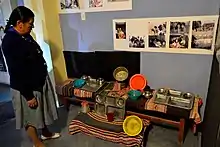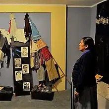 ![]() Mendoza de Ascarza en el museo del ANFASEP observando fotos de jóvenes desaparecidos (la segunda foto de la línea de la derecha es de Arquímedes Mendoza, el hijo desaparecido hasta la actualidad). | ||