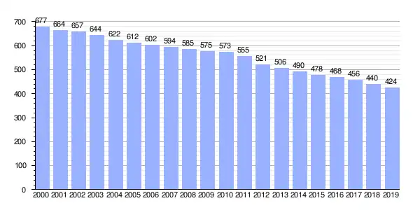 Gráfica de evolución demográfica de Angeriz entre 2000 y 2019 |