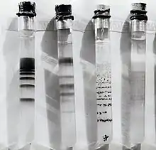 Cuando se producen en un tubo de ensayo, por difusión de un componente desde la parte superior, en lugar de anillos se forman capas o bandas de precipitado.