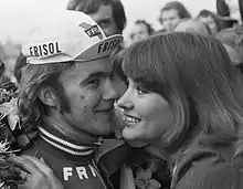 Anke Groot felicita al ganador de la Vuelta a Holanda Septentrional en 1974, Theo Smit