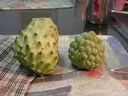 Tiene las hojas ovadas, coriáceas, con las flores amarillas y frutos múltiples, grandes, comestible, con semillas. El fruto, muy sabroso, es conocido como crema de manzana.