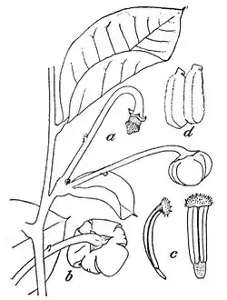 Es un arbusto de 5 a 6 metros de altura. Sus ramas tienen lenticelas discretas de color marrón. Sus hojas ovales membranosas son 3 a 5 por 2.5 a 3.2 centímetros con ápice redondeado que termina en un punto pequeño abrupto. Las hojas no tienen pelo en su superficie superior y en su superficie inferior, excepto a lo largo de la nervadura central y las venas cuando son jóvenes. Las hojas tienen 10 venas secundarias que emanan de cada lado de la nervadura central. Sus pecíolos tienen 2 milímetros de largo y tienen una ranura en su parte superior. Sus pedúnculos recurvados son de 2.5 a 4 centímetros de largo, extra- axilares y generalmente emergen frente a una hoja. Los pedúnculos son solitarios o en pares. Los pedúnculos tienen una bráctea, cubierta de pelos de color óxido, en su base y otra en su punto medio.