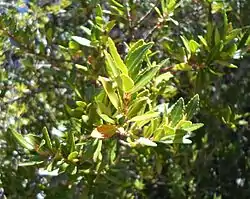Las hojas son opuestas, dentadas de 2–5 cm de largo. Las pequeñas flores crecen en las axilas de las hojas y tienen cuatro pétalos de color verde amarillento.[2]