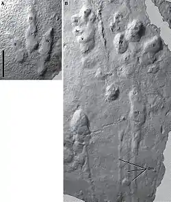 ![]() Réplicas positivas de huellas de Grallator (A) y Anomoepus (B) en Moyeni. | ||