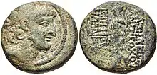 - Este epíteto también lo utilizó el rey Antíoco XIII (r. 82-64 a. C.),[52] que fue el último rey seléucida, tras cuya muerte Roma ocupó Siria.[53] Malalas usó el epíteto «Dioniso» para referirse a Antíoco XIII,[54] que de hecho era un epíteto de Antíoco XII, que nunca gobernó Antioquía.[55] Según el historiador Glanville Downey, el antiguo historiador bizantino confundió Antíoco XIII con Antíoco XII,[53] y utilizó el epíteto «Filadelfo» para referirse a Antíoco XI.[47]