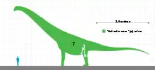 Una tabla de tallas hipotética de A. giganteus . Debido a los restos limitados, el tamaño exacto es incierto. A una reconstrucción de A. giganteus, publicada en 1956 por Carlos Rusconi, se le dio una longitud de alrededor de 30 metros. En 1969, van Valen lo consideró de tamaño similar al Giraffatitan brancai, entonces llamado Brachiosaurus brancai. Basado en una estimación de masa anterior de G. brancai por Edwin Harris Colbert en 1962, van Valen le dio a A. giganteus una masa estimada de alrededor de 80 toneladas métricas.[8] En 1994, Gregory S. Paul estimó el peso de A. giganteus y Argentinosaurus entre 80 y 100 toneladas y longitudes de 30 a 35 metros de largo.[9] Extrapolando los parámetros del fémur, un estudio de 2004 de Gerardo Mazzetta y sus colegas estimó la masa de A. giganteus en aproximadamente 69 toneladas, ligeramente más pequeño que el Argentinosaurus, que en el mismo estudio se estimó en casi 73 toneladas métricas. Esto colocaría a A. giganteus entre los animales terrestres más pesados conocidos.[4] En 2006, Kenneth Carpenter utilizó el Saltasaurus de cuello corto como guía y estimó una longitud más corta de 23 metros de largo.[10] En 2012, Thomas holtz dio una longitud de 33 metros y un peso estimado de 58 a 65 toneladas métricas.[11][12]