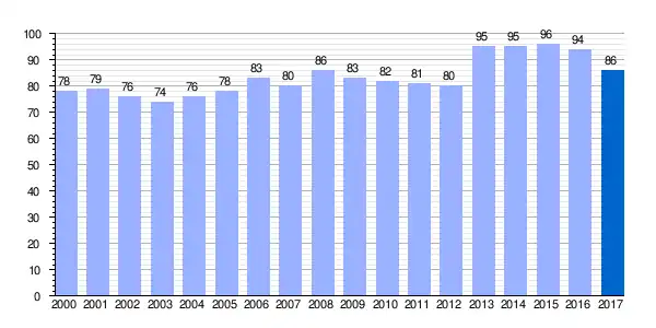 Gráfica de evolución demográfica de Antezana de Foronda[5] entre 2000 y 2017 |