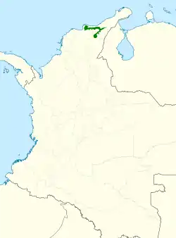 Habita bosques premontanos húmedos y secos, en elevaciones entre 600 y 1.700 m de altitud en la Sierra Nevada de Santa Marta.[4]
