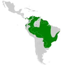 Pueden encontrarse desde el oeste de Panamá y Colombia, Ecuador, Venezuela, hacia el este hasta Trinidad y Tobago, Guyana, Surinam y la Guayana francesa, y hacia el sur hasta Perú, este de Bolivia, Paraguay, noreste de Argentina y todo Brasil hasta el sur.[2][1]