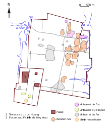La ciudad estaba rodeada por un muro perimetral de 14 kilómetros (8,7 mi) de tierra apisonada. La ciudad consistía en una ciudad exterior y una ciudad interior. La muralla exterior de la ciudad alcanzó un máximo de 43 metros (47,0 yd) de ancho de base, con un promedio de 20 a 30 metros (21,9 a 32,8 yd) de ancho. La muralla interior de la ciudad alcanzó un máximo de 60 metros (65,6 yd) de ancho de base. La ciudad tenía un sistema de alcantarillado y suministro de agua.