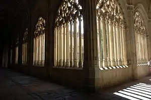 Las obras del claustro comenzaron en 1472 y fueron pagadas por el mismo obispo. Se edificó aprovechando parte del solar del antiguo palacio episcopal, en aquellos momentos derruido, añadiendo a su lado el nuevo palacio. Es un hermoso ejemplo de arquitectura gótica, de planta cuadrada y cinco tramos de galería cubiertos con bóvedas de crucería simple, y la portada del mismo fue sufragada por Isabel la Católica.