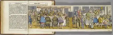 El conde, vestido con un sombrero negro, se sienta en el lado derecho de la mesa frente al espectador. A su izquierda está su hermano Mark Sittich, un poderoso cardenal en Roma y el obispo de Constanza.[14] Hortensia Borromea, la esposa del conde Jakob Hannibal, está representada en el lado izquierdo de Mark Sittich.[6] Frente a ellos está el primo del conde, el cardenal Carlos Borromeo, una figura destacada de la Contrarreforma que luego fue beatificado por la Iglesia católica.[16] Carlos Borromeo también era el medio hermano de la esposa del conde.[17] Se puede apreciar como el conde acaba de ofrecerle a su hermano Mark Sittich una fruta pequeña y redonda, que su hermano aceptó y que está sujeta en la mesa con su dedo índice izquierdo. El gesto muestra la estrecha relación entre los hermanos. Otra escena íntima se desarrolla en el centro de la mesa donde están sentados los novios: el novio Fortunat Freiherr zu Madruz ha perforado con la punta de su cuchillo una pera que su novia Margaretha von Hohenems (la hermana del anfitrión) conserva con la mano en su plato.[6]