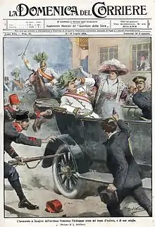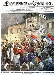 Portada del Domenica del Corriere del 4 de mayo de 1913. Nicolás I de Montenegro, aclamado por el pueblo tras la caída de la fortaleza otomana de Escútari.