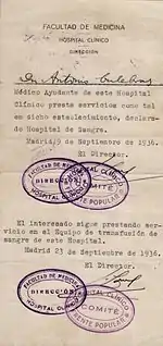 Por su formación académica y por las necesidades de la guerra, es destinado en septiembre de 1936 al Hospital Clínico de Madrid, denominado a partir de esas fechas, Hospital de Sangre intuyendo ya su función primordial de proporcionar todas las terapias relacionadas con el fluido vital para tratar a los heridos que se presuponía llegarían en aluvión desde el frente próximo. El Instituto hispano-canadiense de transfusión, en el número 36 de la calle del Príncipe de Vergara de Madrid, fue uno de los primeros bancos de sangre creados en España y también en el mundo. Allí, en colaboración con Edward Barski de la Brigada Lincoln norteamericana y Norman Bethune del Batallón Papineau de Canadá desarrollaron e instauraron las unidades de Transfusión de Sangre en el frente de Madrid[3] y en el que el Dr. Culebras, junto a resto del equipo sanitario, prestaron un extraordinario servicio;[4] ver figura 1 donde se muestra la certificación de prestación de servicios en el Hospital de Sangre, 1936. Posteriormente, Antonio Culebras se trasladó a Linares (Jaén) donde ejerció de Comandante Jefe de Transfusión de Sangre de los Ejércitos de Extremadura y Andalucía hasta el final de la guerra.