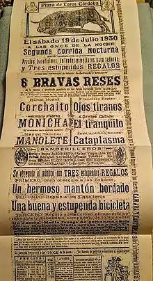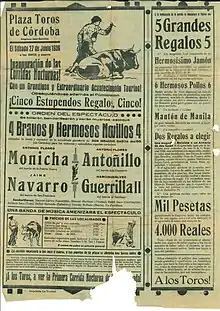 Patricio Hidalgo Luque en FIESTA DE LOS TOROS EN CÓRDOBA EN 1936 Dice: "En efecto, la primera nocturna se celebró el sábado 27 de junio. Componían el cartel Antonio Flores Díaz “Monicha”, Antonio Flores “Antoñillo”, Jaime Navarro y Narciso Gálvez “Guerrilla II”. El festejo fue entretenido, siendo las crónicas más favorables para “Antoñillo”. Unos espontáneos que se lanzaron al ruedo fueron multados con 250 pesetas; al no haber satisfecho el importe de la sanción ingresaron en prisión para cumplir arresto de 15 días. Como era de esperar, el sorteo de los regalos al final de la becerrada transcurrió entre el regocijo del respetable".