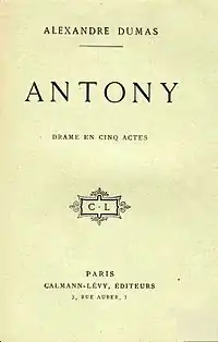 Antony es una obra de teatro en prosa en cinco actos, escrita por Alejandro Dumas (padre), en 1831.[1] Muchos afirman que Dumas se inspiró en una de sus pasiones personales para escribir este drama. En sus Memorias dice sobre ella: "...Antony no es un drama, Antony no es una tragedia, Antony no es una obra teatral; Antony es una escena de amor, celos y cólera, en cinco actos..."
