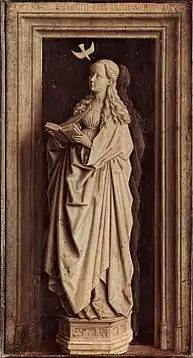 Es una de las obras más revolucionarias de la pintura renacentista.[1] Lo innovador de esta pintura es el trabajo de Jan Van Eyck a la hora de fingir que son dos esculturas insertas en nichos, donde hasta el marco, rebasado aparentemente por el ala del ángel, es un trampantojo. También los basamentos de piedra sobre los que se alzan las supuestas estatuas sobresalen de los montantes. Ya en el Políptico de Gante invirtió el tradicional predominio de la escultura sobre la pintura en los retablos, haciendo que el retablo fuera íntegramente pintado y, además, fingiendo que hay dos esculturas con los postigos cerrados, ante las que rezan los donantes. Aquí, como en el Políptico de Gante, las figuras están realizadas en grisalla.[2] Son como estatuillas que reposan en peanas con un fondo negro de mármol pulido sobre el que se reproduce, a modo de espejo, lo que sería la parte trasera de las esculturas. Sabe reproducir las diferentes texturas de las piedras. Da la impresión de una verdadera obra tridimensional,[2] salvo por la paloma, que evidentemente nunca podría estar esculpida en solitario, sin nada que la sustentase.