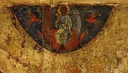 Sobre el icono, Dios está representado en una mandorla gris oscura, sentado en un trono rojo, apoyado por querubines. Sobre ellos están los serafines con flabelos de oro. La cabeza está rodeada por un nimbo. En su mano izquierda sostiene un pergamino, en su mano derecha un rayo de luz brilla en dirección a su madre. Una inscripción de arriba abajo lleva las iniciales de su nombre.[32]