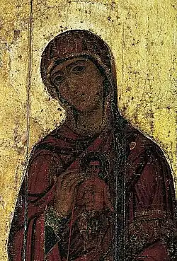 El rostro de la Virgen está representado sin expresiones emocionales y sin sentimientos fuertes. Esta actitud es el símbolo de su humildad ante la voluntad de Dios.[24] Su cabeza está ligeramente inclinada hacia el mensajero que se le aparece. Un ligero enrojecimiento de su cara, mejillas, párpados y cuello parece ser perceptible para la crítica de arte Galina Kolpakova. En su mano derecha sostiene un ovillo de hilo rojo —que se menciona en el relato apócrifo del Protoevangelio de Santiago—. El hilo pasa por los dedos de la mano derecha de la Virgen y baja hasta el balón, sin nada que lo retenga. La mano derecha se representa con el dedo índice haciendo un gesto de bendición, que le hace tocar la aureola del niño Jesús.[25] Este hilo simboliza la sangre virginal. Es una explicación de la Encarnación. Algunos exégetas explican la posibilidad del nacimiento de Jesús de la sangre de la Virgen por el hecho de que el Espíritu Santo habría tomado, en el momento de la Anunciación, la sangre que sería la del niño Jesús en el momento del nacimiento. Este hilo que parece salir del lado izquierdo y del corazón simboliza esta inexplicable encarnación, cuya realidad está en el corazón de la fe cristiana.[26][27]