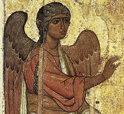 - las similitudes en la postura del Arcángel Gabriel en este icono con las representadas, a mediados del siglo XII, en el monasterio del Mirozha en Pskov.[18]