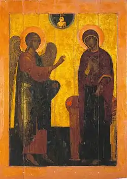 La Anunciación que está representada por el icono en una rara versión de la iconografía: la Virgen María ya lleva la imagen de Jesús en su seno. El pintor también utiliza detalles apócrifos, como el hilo rojo en las manos de la Virgen. En la parte inferior del icono se encuentra la imagen de Dios, un anciano de pelo gris (Antiquus dierum), entronizado sobre querubines, rodeado de serafines que lo glorifican. Según Víctor Lazarev, esta representación académica pertenece a un período posterior al de los iconoclastas y está ligada a la influencia de los textos litúrgicos, como el sinasario del 24 de marzo, el oktoíjos del himno a la Virgen María.[20]