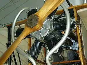 ![]() Anzani 6 de 45 HP visto del lado de la hélice. El carburador se encuentra entre los 2 cilindros inferiores. | ||