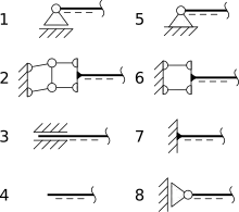 Representación simbólica de tipos de apoyos que permiten que una barra horizontal se mueva de diferentes maneras en el plano:[5] 1) Desplazamiento horizontal y rotación 2) Traslación en todas las direcciones 3) Movimiento lineal 4) Extremo de la barra que se mueve libremente 5) Par cinemático 6) Desplazamiento paralelo en una trayectoria determinada 7) Restricción 8) Desplazamiento vertical paralelo y rotación |