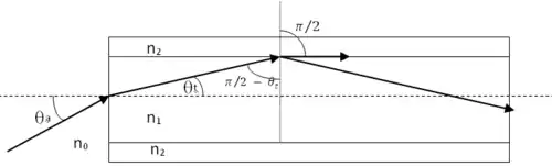 Ángulo de Aceptancia: es el máximo ángulo en el cual el rayo de luz incidente es atrapado por las paredes de la fibra. En este caso el rayo de luz se refleja totalmente en el recubrimiento de la misma, por lo que el ángulo de transmisión, sobre el recubrimiento de la fibra, es 90º.