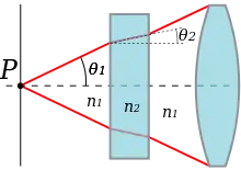 donde n es el índice de refracción del medio en el que la lente se encuentra (1 para el aire, 1,33 para el agua pura, y hasta 1,56 para algunos aceites), y θ es la mitad del ángulo de aceptancia máximo que puede entrar o salir de la lente. La AN se mide generalmente con respecto a un objeto o a un punto de una imagen y varía con la posición del punto.[1]