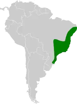Su hábitat natural es el bosque húmedo y los bosques primarios muy degradados tropicales y subtropicales. En endémica de Brasil.[4] Aunque su población no ha sido cuantificada, se la considera bastante común.[5]
