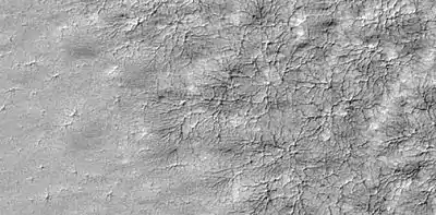 Las formaciones, vistas individualmente, forman una estructura redonda y lobulada, reminiscente de una telaraña. Generalmente, radian hacia fuera en lóbulos, desde un punto central.[1] El punto central es a menudo, pero no siempre, un cráter.[2] La formación es una agregación por difusión limitada, fenómeno observable también en raíces, ramas, etc.