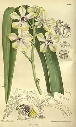 Es una orquídea de gran tamaño relacionada con Vanda, monopodial, que prefiere el clima cálido, con crecimiento de litofita o terrestre y con inflorescencias axilares, erectas y luego arqueadas con el tiempo de 4 a 5 metros de largo, ramificadas, y 1-3 flores, con un raquis de verde oliva y negro con brácteas comprimidas que llevan sucesivamente abiertas, gruesas flores carnosas que aparecen en cualquier época del año y la misma inflorescencia pueden florecer esporádicamente durante años, pero solo con una o dos flores por inflorescencia en un momento dado.[1]