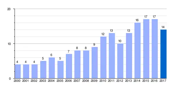 Gráfica de evolución demográfica de Arbígano[1] entre 2000 y 2017 |