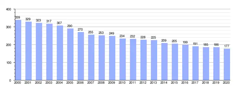 Gráfica de evolución demográfica de Arcallana[3] entre 2000 y 2020 |