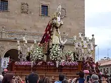 - Madre de Dios del Rosario: se trata de una imagen de vestir de la Virgen con el Niño realizada en madera de cedro por Sergio Torres Romero en 2009.[19] La imagen luce un manto en terciopelo granate bordado en cordonería, canutillo y lentejuelas de oro adornado con pedrería de cristales tallados blancos y rojos, realizado por Manuel García Bellido. La orla del manto contiene medallones con imágenes de sibilas y profetas, tomados de las pinturas de Miguel Ángel en la Capilla Sixtina, y el centro de la espalda contiene la escena de la Virgen entregando un rosario a Santo Domingo, cuadro de Luca Giordano conservado en el museo nacional Capodimonte de Nápoles.[20]